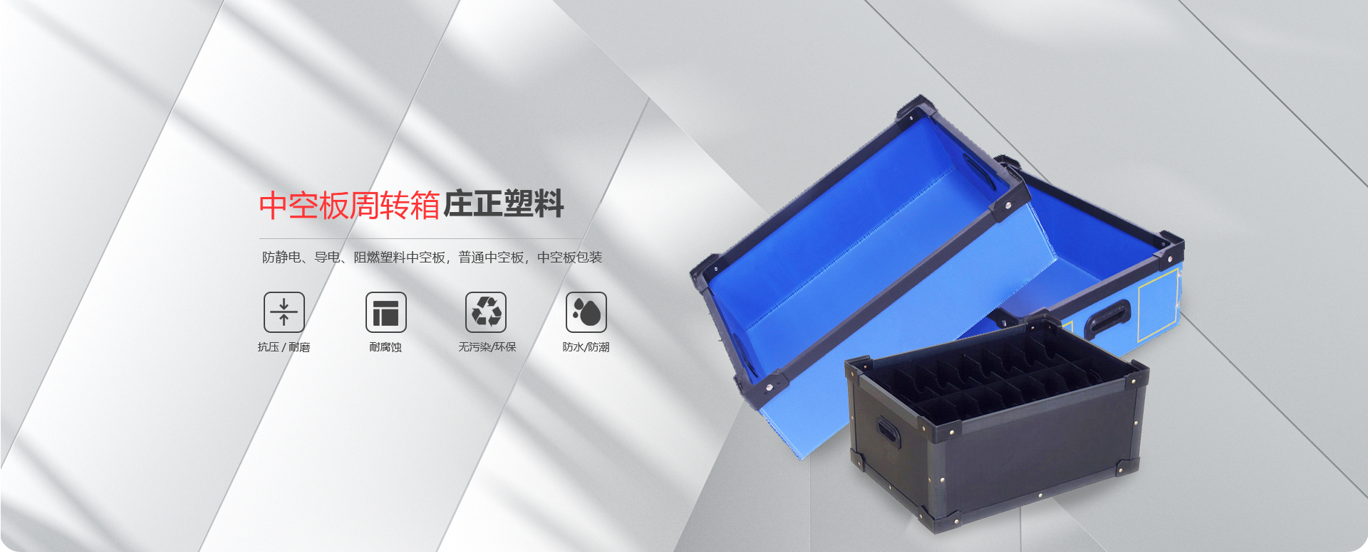 威海莊正塑料中空板有限公司是一家專注于圍板箱產(chǎn)品和中空板產(chǎn)品研究、開發(fā)、生產(chǎn)及銷售的高科技企業(yè)。我司專業(yè)生產(chǎn)銷售圍板箱、防靜電、導電、阻燃塑料中空板,普通中空板,中空板包裝等。是一家及研發(fā)、設計、生產(chǎn)、銷售一體化的專業(yè)制造商。產(chǎn)品具有質輕、防潮、耐油污、抗腐蝕、無毒、無污染顏色豐富的新型環(huán)保產(chǎn)品。 主要產(chǎn)品:圍板箱、普通塑料中空板,防靜電、導電塑料中空板,中空板周轉箱,中空板包裝箱,中空板墊板,中空板托盤、塑料包裝制品等系列產(chǎn)品。